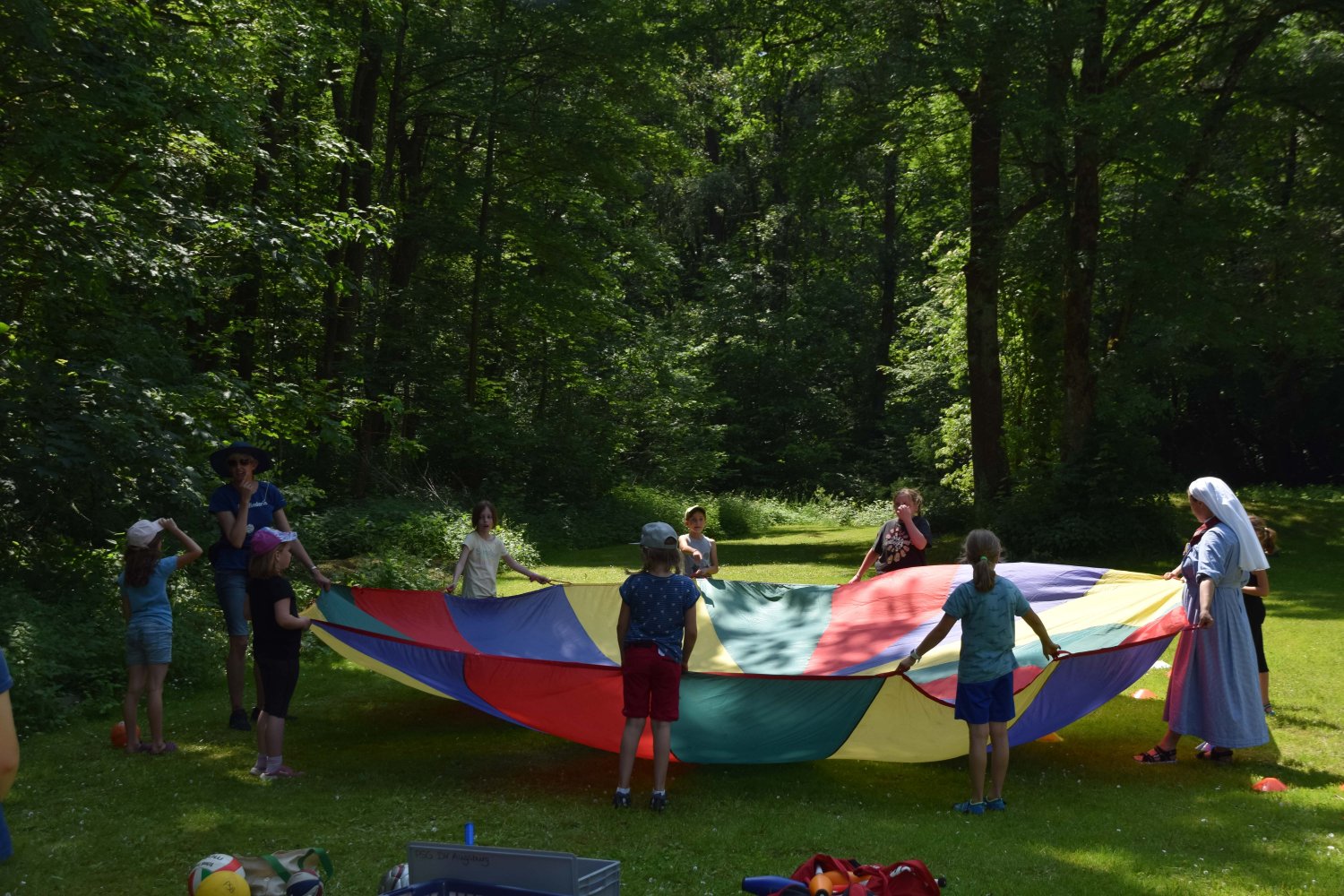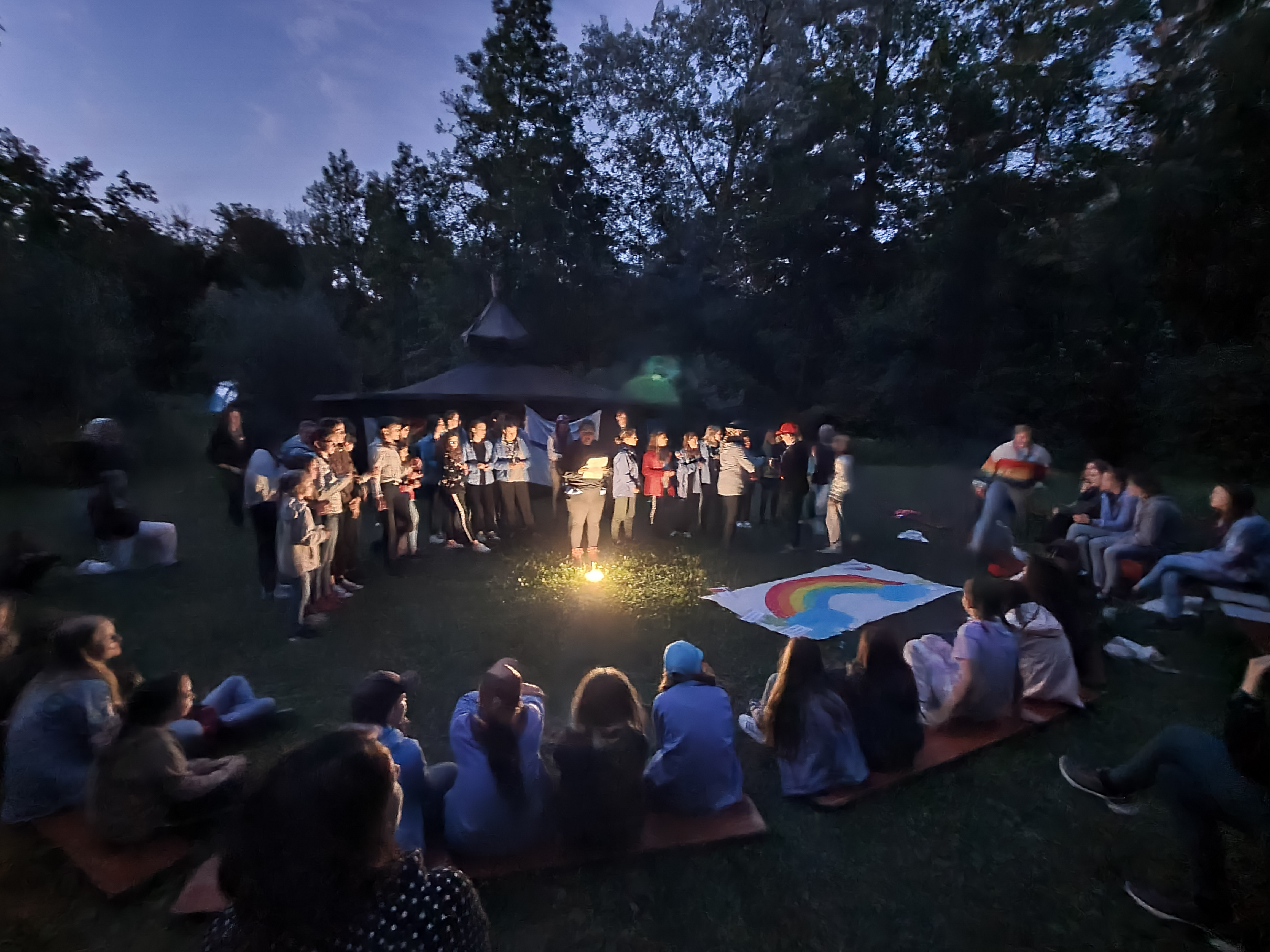 Bei dem Abschlussgottesdienst mit unserer Kuratin Schwester Annika wurden die erfolgreichen Abenteuer reflektiert. Den Abschluss fand das Lager mit einem Bunten Abend, an dem unter sensationeller Stimmung verschiedene Einlagen dargeboten wurden. Hier konnte man die neuen Pfadfinderinnen* T-Shirts der Diözese Augsburg bewundern, die ein paar Tage vorher erst vorgestellt wurden.